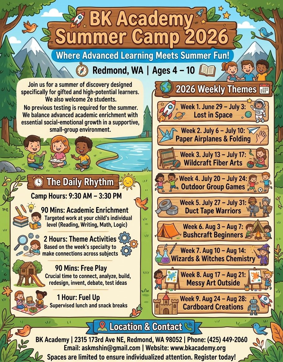 BK (Bellevue, King County) Academy is a post-constructivism school where teachers’ roles to guide and scaffold students are emphasized. We serve highly gifted students from preschool to 5th grade. BK Academy is a small school with an individualized curriculum and emphasis on social-emotional development. Dr. Meera Shin started the school to support her own gifted child and expanded it when she saw the needs of other gifted students weren’t being met with standard curriculum. The individual attention and support each child receives is why BK Academy stands out with neurologists, psychiatrists, and other cognitive experts in the region. To schedule a tour, hear about wait lists, or answer any questions you may email Dr. Meera Shin directly.